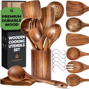 LIFELONG QUALITY Woodenhouse non toxic cooking utensils will last a lifetime, they are made of one piece 100% Natural Teak Wood. This wood kitchen utensils set is solid, sturdy and have a superb finish. May vary in shade due to its natural material.A..