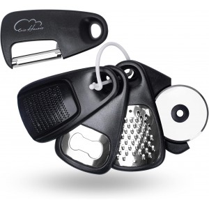 [Complete KITCHEN TOOLS SET] Set includes 1 grater for cheeses, vegetables, chocolate; 1 grinder for garlic or ginger; 1 pizza cutter / wheel for pizzas and flat breads; 1 bottle opener; 1 swivel peeler for vegetables and fruits; Outfit a new kitchen..